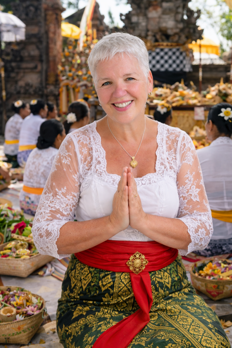 I asked the staff at the Swan Paradise. They were magnificent. I had bought a beautiful green wrap in Ubud, for the occasion, and the lovely girl at reception helped me dress properly in full Balinese style.